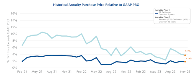 The graph below shows the spread between annuity purchase price above GAAP projected benefit obligation (PBO). We refer to GAAP PBO and accounting book value interchangeably. In November, we noted the spread between annuity purchase price above GAAP PBO for both plans narrowed even more so than the previous month. For Annuity Plan 1, the spread decreased to 1.79% and Annuity Plan 2 dropped to 3.69%. The current spreads for both hypothetical plans are lower than historical averages. An increase in annuity purchase rates inversely lowers annuity purchase prices relative to accounting book value. Please note that the below PBO calculations exclude future overhead costs paid by plan sponsors to retain participants in the plan. Administrative expenses and PBGC premiums are examples of these overhead costs.