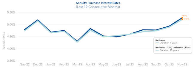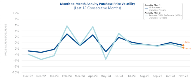 Throughout 2023, Annuity Purchase interest rates have displayed a consistent upward trend. This month, the annuity purchase price decreased for both hypothetical plans. For Annuity Plan 1 by 1.26% and for Annuity Plan 2 by 2.47%. Annuity Purchase interest rates in 2023 have been less volatile than 2022. Although the graph below shows a month-to-month fluctuation, annuity purchase interest rates are market dependent and actually fluctuate daily. To hedge against this short-term volatility, a plan sponsor terminating their pension plan could settle the retiree portion of their liability to "lock in" favorable rates.
