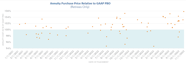 Annuity purchase cost for retiree placements brokered by October Three Annuity Services has on average been 100.83% of the pension accounting value (GAAP PBO)