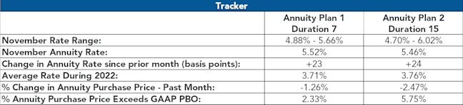 Strong pension risk transfer market momentum carried through the first half of the year has extended into the latter of 2023. As mentioned in the Pension Finance Update, over the last three months, pension funding has experienced a decline due to falling stock markets, but have been partially offset by higher interest rates. This month witnessed a substantial rise in annuity purchase rates, reaching a new all-time high. The average duration 7 annuity purchase interest rate peaked at 5.52% and the average duration 15 annuity purchase interest rate rose to 5.46%. Since the beginning of the month, rates have slightly decreased, but remain above average. From the second quarter onward, we have noted a consistent month-to-month rise in rates. Higher annuity interest rates are enticing plan sponsors to consider de-risking their defined benefit plans. In the last month, the average duration 7 annuity rate increased 23 basis points, while the average duration 15 annuity rate increased 24 basis points. Insurance carriers are busier than ever with their calendars quickly filling up. Carriers are being very selective in the placements they choose to partake in. Although many have expressed minimal bandwidth left for 2023, it is encouraged to connect with an annuity broker sooner rather than later to achieve de-risking goals in 2024.