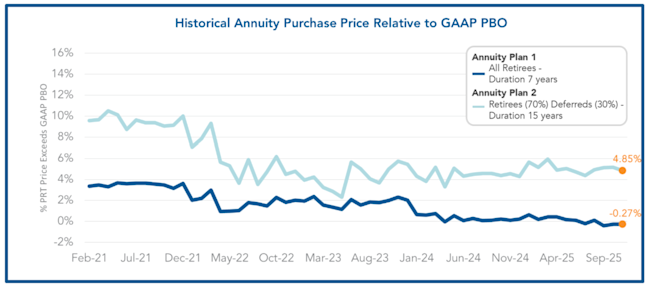 As of early November, the 10-year treasury rate was approximately 4.11% while the 30-year treasury rate was around 4.67%. This positioning of these rates represents a modest shift compared to early November of 2024, which were approximately 4.37% for the 10-year and 5.57% for the 30-year. These rates are closely aligned with the annuity purchase interest rates, the 10-year treasury correlating to the duration 7 rate, and the 30-year treasury corresponding to the duration 15 rate. Stability in long-duration yields has historically helped minimize any major increases in pension plan liabilities, creating more favorable conditions for plan sponsors when exploring pension risk transfer transactions. Market observers have noted that treasury yields could experience more upward pressure amid growing optimism surrounding the timely resolution of the government shutdown. Since annuity purchases do not need to be on an all or nothing basis, plan sponsors can benefit from proactively exploring strategies to help position their plans for long-term success in the coming years.