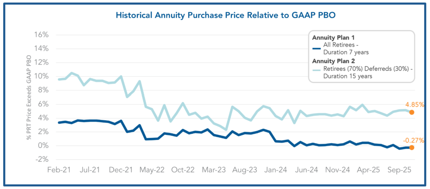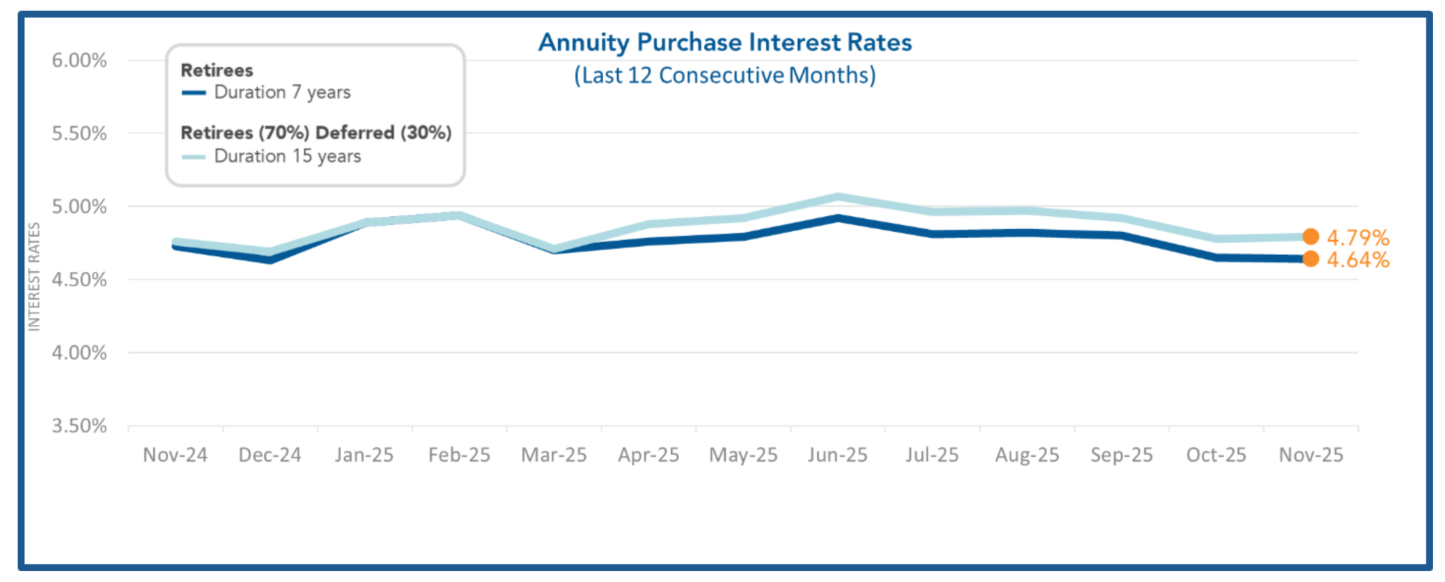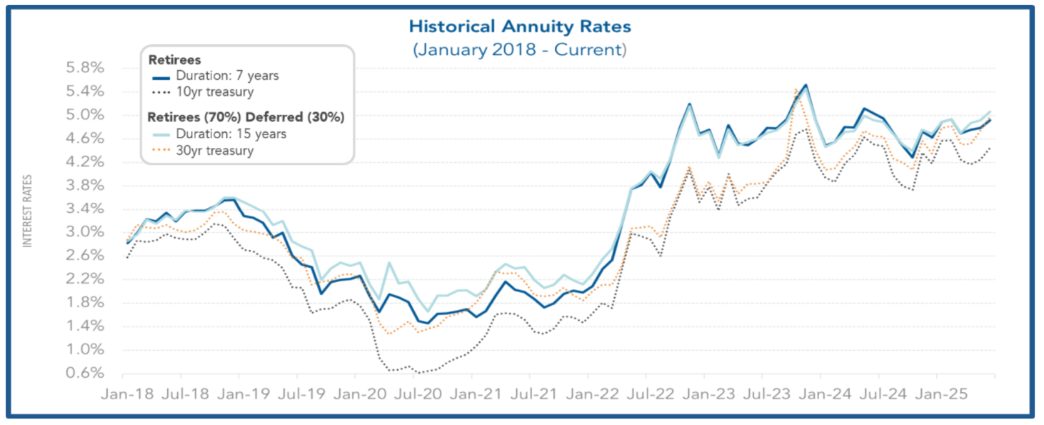 As of early November, the 10-year treasury rate was approximately 4.11% while the 30-year treasury rate was around 4.67%. This positioning of these rates represents a modest shift compared to early November of 2024, which were approximately 4.37% for the 10-year and 5.57% for the 30-year. These rates are closely aligned with the annuity purchase interest rates, the 10-year treasury correlating to the duration 7 rate, and the 30-year treasury corresponding to the duration 15 rate. Stability in long-duration yields has historically helped minimize any major increases in pension plan liabilities, creating more favorable conditions for plan sponsors when exploring pension risk transfer transactions. Market observers have noted that treasury yields could experience more upward pressure amid growing optimism surrounding the timely resolution of the government shutdown. Since annuity purchases do not need to be on an all or nothing basis, plan sponsors can benefit from proactively exploring strategies to help position their plans for long-term success in the coming years.