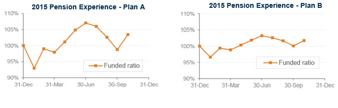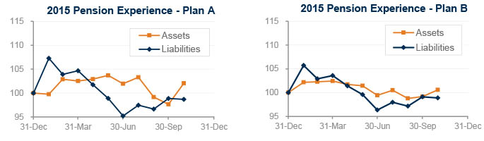 Interest rates rose less than 0.1% during October and corporate bond yields are now about 0.30% higher than at the end of 2014 (Treasuries have risen about 0.15% this year, so credit spreads have increased 0.15% during 2015.) Last month’s move left pension liabilities largely unchanged during October and about 1% lower than at December 31, 2014.