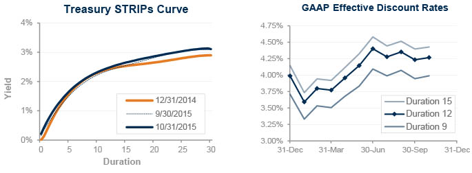 Both funding and accounting liabilities are now driven by market interest rates. The graph on the left compares Treasury STRIPs yields at December 31, 2014, and October 31, 2015, and also shows the movement in rates last month. The graph on the right shows our estimate of movements in effective GAAP discount rates for pension obligations of various duration during 2015 so far: