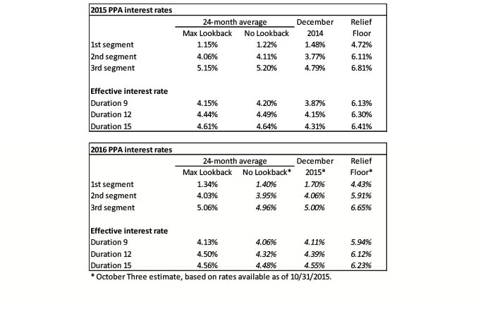 The table below summarizes rates that plan sponsors are required to use for IRS funding purposes for 2015, along with estimates for 2016. Pre-relief, both 24-month averages and December ‘spot’ rates, which are still required for some calculations, such as PBGC premiums, are also included.