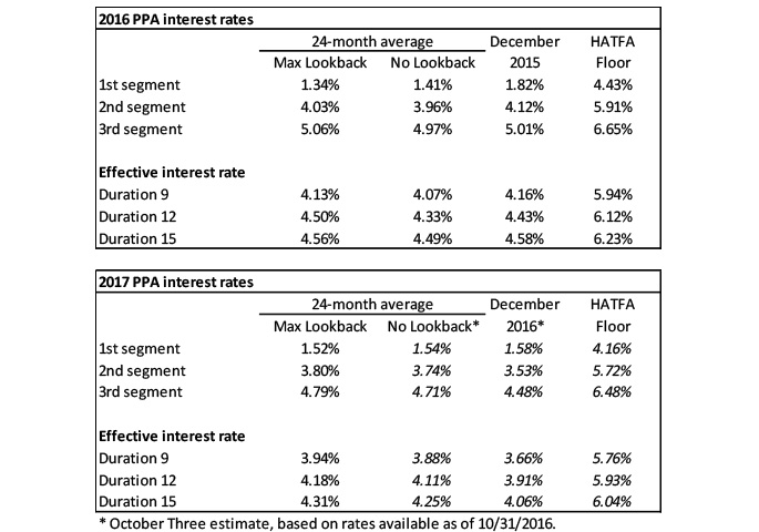The table below summarizes rates that plan sponsors are required to use for IRS funding purposes for 2016, along with estimates for 2017. Pre-relief, both 24-month averages and December ‘spot’ rates, which are still required for some calculations, such as PBGC premiums, are also included.