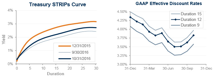Pension liabilities (for funding, accounting, and de-risking purposes) are now driven by market interest rates. The graph on the left compares Treasury STRIPs yields at December 31, 2015 and October 31, 2016, and also shows the movement in rates last month. The graph on the right shows our estimate of movements in effective GAAP discount rates for pension obligations of various duration during 2016:
