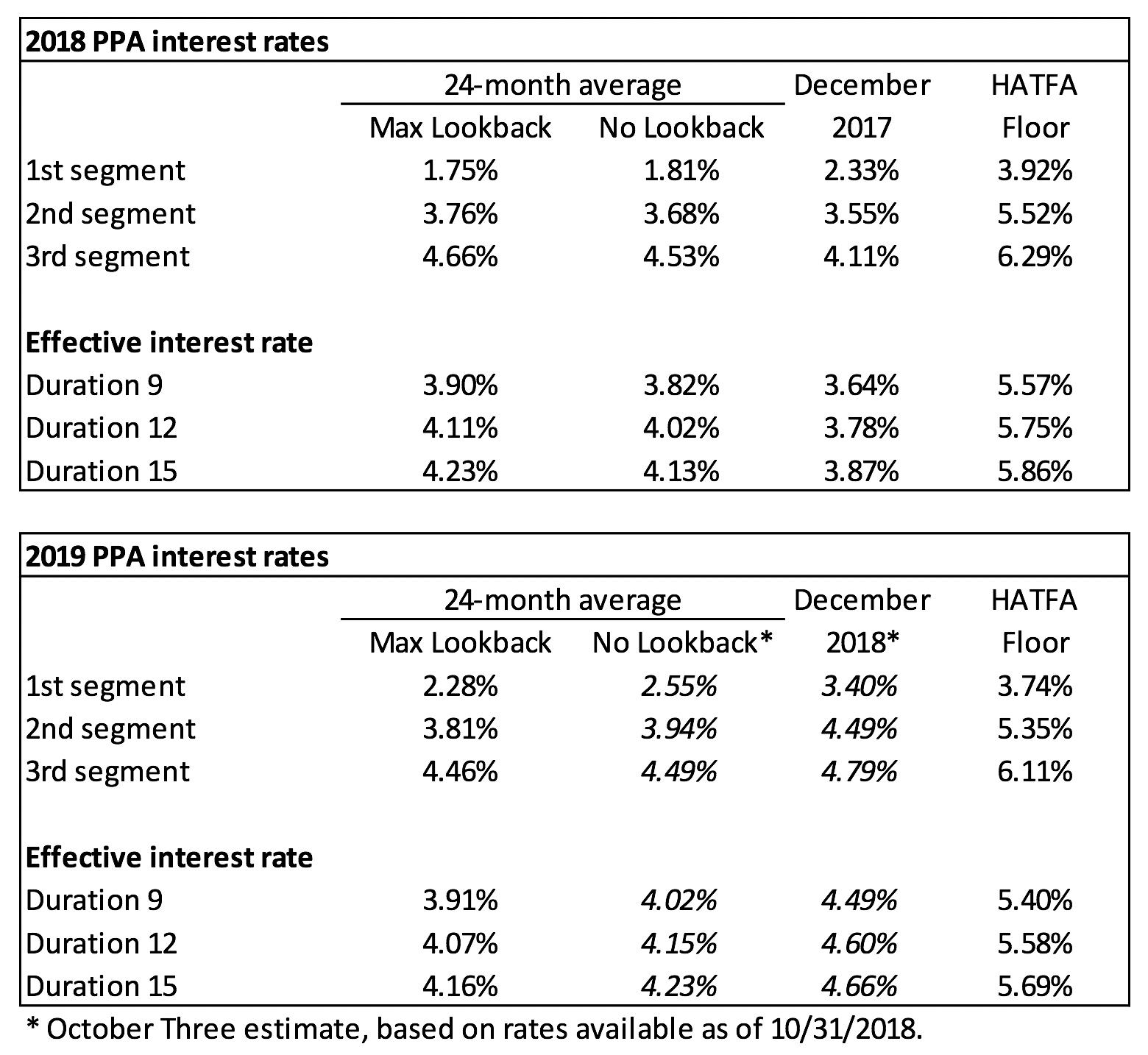 The table below summarizes rates that plan sponsors are required to use for IRS funding purposes for 2018, along with estimates for 2019. Pre-relief, both 24-month averages and December ‘spot’ rates, which are still required for some calculations, such as PBGC premiums, are also included.