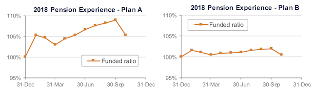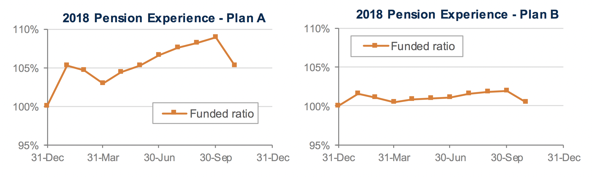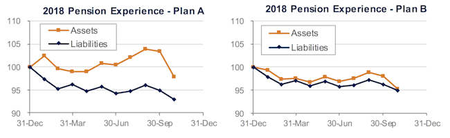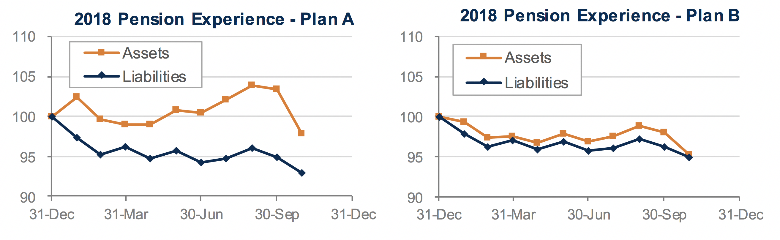 While pension assets have now earned a negative return during 2018, funded status has improved due to the power of higher interest rates – rates have increased around 0.8% this year and are now at their highest level in nearly five years. However, a year that looked so promising just a month ago is now in danger of turning into a pumpkin. The graphs below show the movement of assets and liabilities for our two model plans so far this year:
