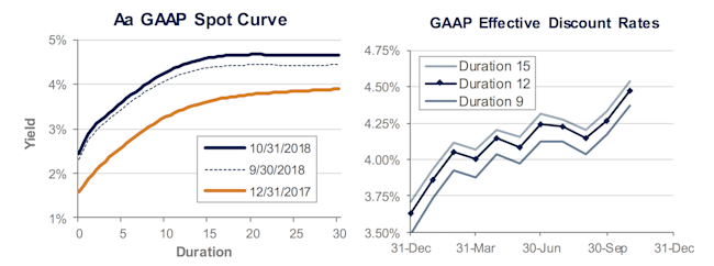 Pension liabilities (for funding, accounting, and de-risking purposes) are now driven by market interest rates. The graph on the left compares our Aa GAAP spot yield curve at December 31, 2017, and October 31, 2018, and it also shows the movement in the curve last month. The graph on the right shows our estimate of movements in effective GAAP discount rates for pension obligations of various duration during 2018: