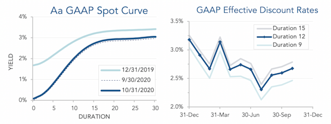 Pension liabilities (for funding, accounting, and de-risking purposes) are driven by market interest rates. The first graph below compares our Aa GAAP spot yield curve at December 31, 2019 and October 31, 2020, and it also shows the (tiny) increase in the curve last month. The second graph below shows our estimate of movements in effective GAAP discount rates for pension obligations of various duration during 2020:
