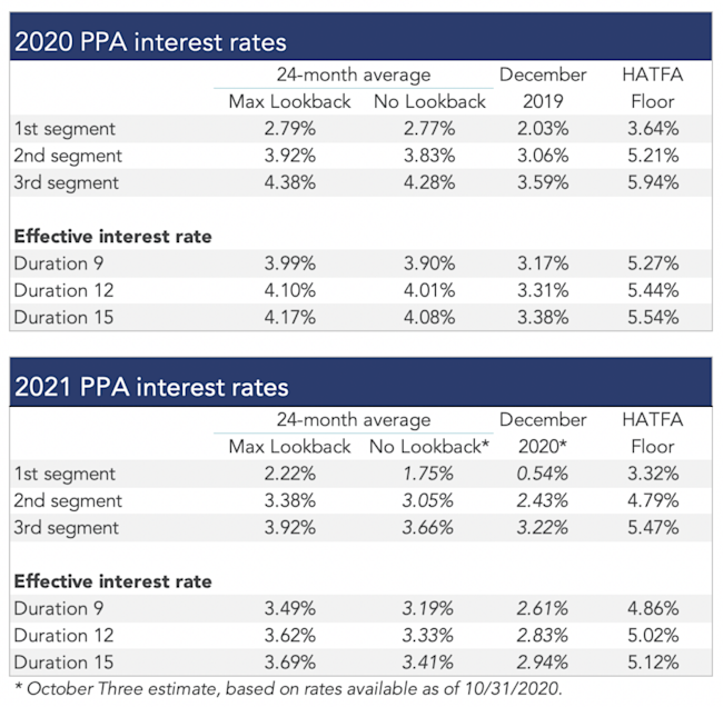 The table below summarizes rates that plan sponsors are required to use for IRS funding purposes for 2020, along with estimates for 2021. Pre-relief, both 24-month averages and December ‘spot’ rates, which are still required for some calculations, such as PBGC premiums, are also included.