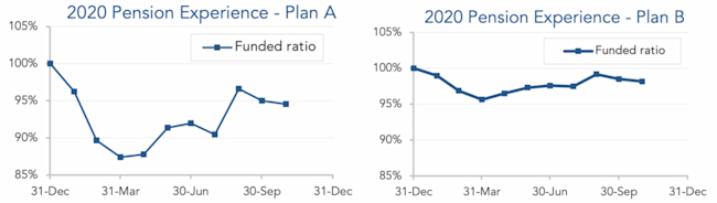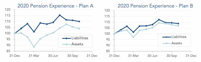 Corporate bond yields rose almost 0.1% in October, pushing pension liabilities down 1%. Through the first ten months of 2020, liabilities have increased 8%-12% for most plans, with long-duration plans seeing the largest increases.