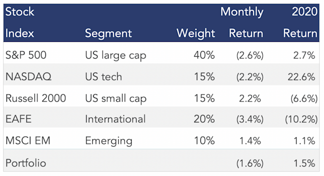 Overall, our traditional 60/40 portfolio lost more than 1% in October but remains up 4% for the year, while the conservative 20/80 portfolio lost 1% last month but remains up 7% through the first ten months of 2020.