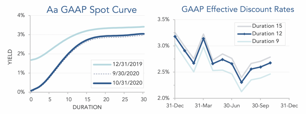 Pension liabilities (for funding, accounting, and de-risking purposes) are driven by market interest rates. The first graph below compares our Aa GAAP spot yield curve at December 31, 2019 and October 31, 2020, and it also shows the (tiny) increase in the curve last month. The second graph below shows our estimate of movements in effective GAAP discount rates for pension obligations of various duration during 2020: