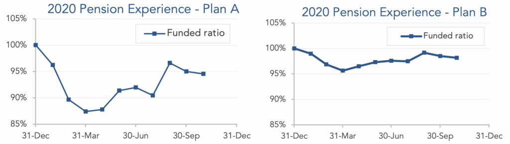 After recovering most of the early year losses this summer, pension finances slipped over the past two months. Barring a recovery between now and year end, 2020 is looking like a poor, but not catastrophic, year for pension finance. The graphs below show the movement of assets and liabilities for our two model plans during the first ten months of the year: