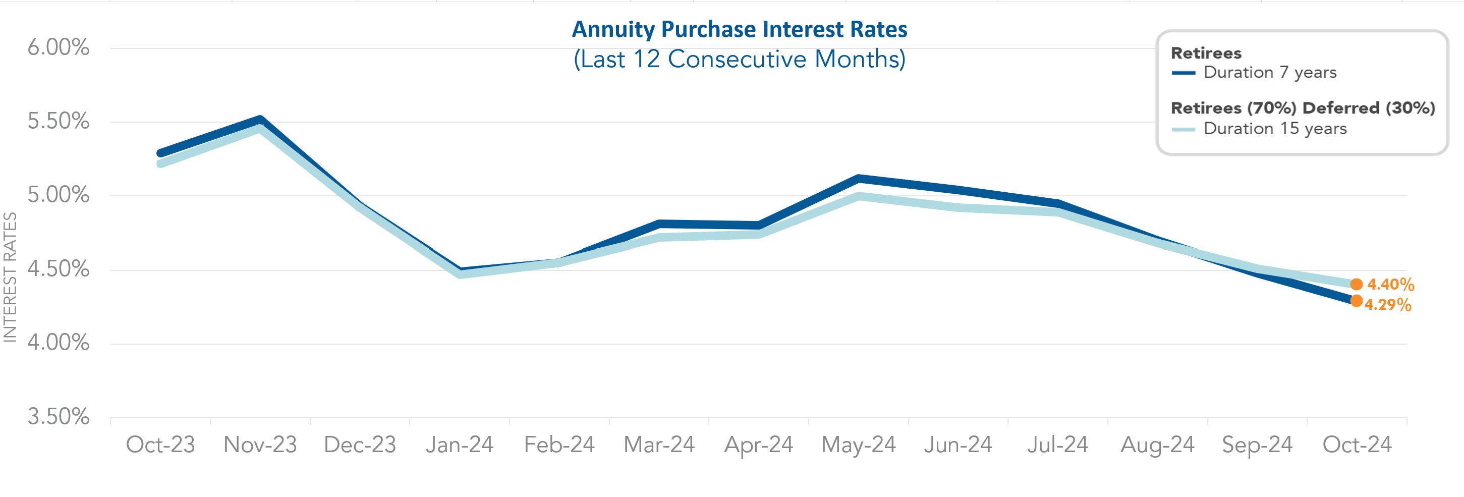 As anticipated, annuity purchase rates have decreased once more, with the average duration 7 rate decreasing 19 basis points and the average duration 15 rate dropping 11 basis points.