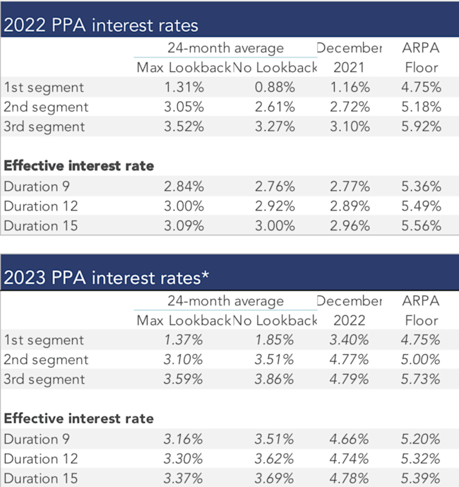 The table below summarizes rates that plan sponsors are required to use for IRS funding purposes for 2022, along with estimates for 2023. Pre-relief, both 24-month averages and December ‘spot’ rates, which are still required for some calculations, such as PBGC premiums, are also included.