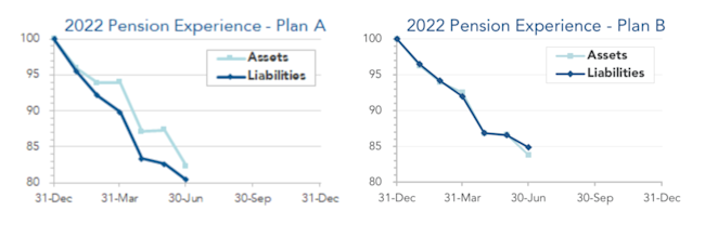 Pension balance sheets shrank by close to 20% in the first half of 2022, but most pension sponsors have managed to at least tread water so far this year, as sharply higher interest rates have neutralized the impact of falling stock markets. The graphs below show the movement of assets and liabilities during the first half of 2022: