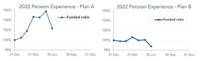 Stocks tumbled again in June, driving the worst month of the year for pension finance. Both model plans1 we track lost ground last month: Plan A lost more than 3% but remains up 2% for the year, while the more conservative Plan B lost 1%, ending the first half of 2022 down 1%: