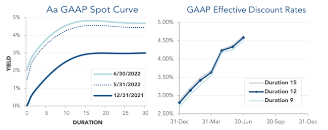 Pension liabilities (for funding, accounting, and de-risking purposes) are driven by market interest rates. The first graph below compares our Aa GAAP spot yield curve at December 31, 2021 and June 30, 2022, and it also shows the movement in the curve last month. The second graph below shows the increase in effective GAAP discount rates for pension obligations of various duration so far during 2022: