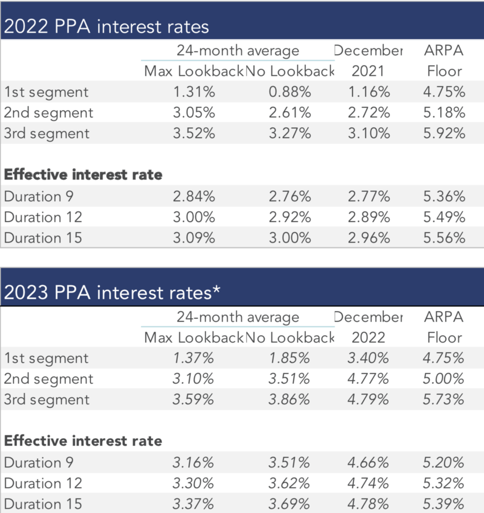 The table below summarizes rates that plan sponsors are required to use for IRS funding purposes for 2022, along with estimates for 2023. Pre-relief, both 24-month averages and December ‘spot’ rates, which are still required for some calculations, such as PBGC premiums, are also included.
