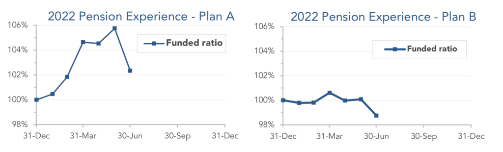 Stocks tumbled again in June, driving the worst month of the year for pension finance. Both model plans1 we track lost ground last month: Plan A lost more than 3% but remains up 2% for the year, while the more conservative Plan B lost 1%, ending the first half of 2022 down 1%: