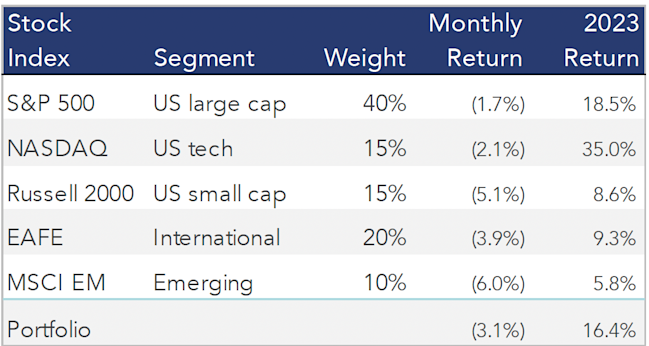 Stocks suffered their worst month of the year so far during August, with all major indexes falling. A diversified stock portfolio lost 3% last month but remains up 16% through the first eight months of 2023: