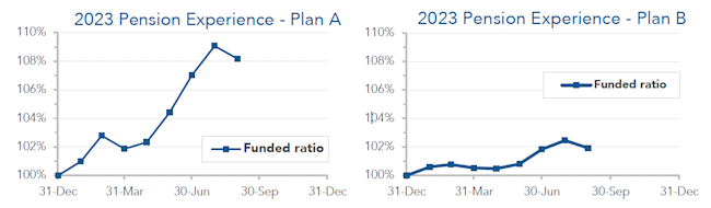 While August was a step backward for pension finance, 2023 continues to shape up as another good year for pension sponsors, with stock markets mostly holding on to double-digit returns while interest rates have moved even higher this year. The graphs below show the movement of assets and liabilities during the first eight months of 2023: