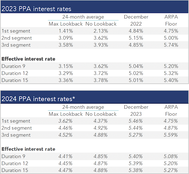 The table below summarizes rates that plan sponsors are required to use for IRS funding purposes for 2023, along with estimates for 2024. Pre-relief, both 24-month averages and December ‘spot’ rates, which are still required for some calculations, such as PBGC premiums, are also included.