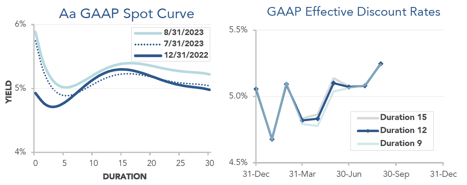 Pension liabilities (for funding, accounting, and de-risking purposes) are driven by market interest rates. The first graph below compares our Aa GAAP spot yield curve at December 31, 2022 and August 31, 2023, and it also shows the movement in the curve last month. The second graph below shows our estimate of movements in effective GAAP discount rates for pension obligations of various duration so far this year: