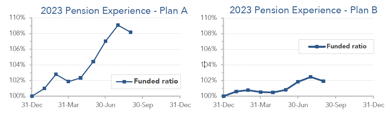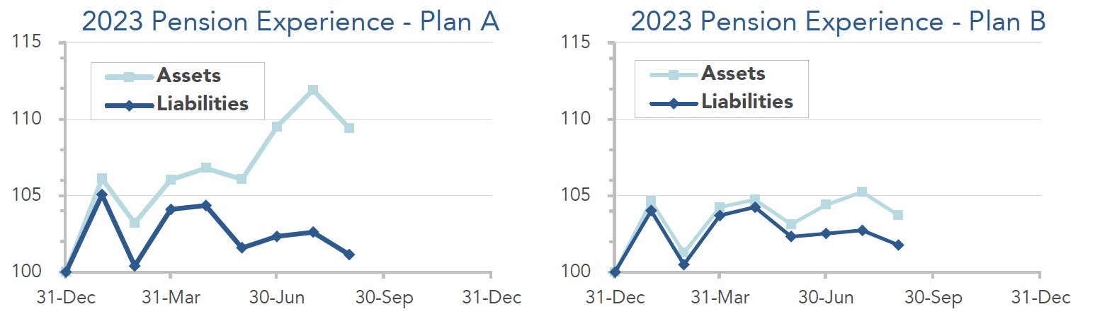 While August was a step backward for pension finance, 2023 continues to shape up as another good year for pension sponsors, with stock markets mostly holding on to double-digit returns while interest rates have moved even higher this year. The graphs below show the movement of assets and liabilities during the first eight months of 2023: