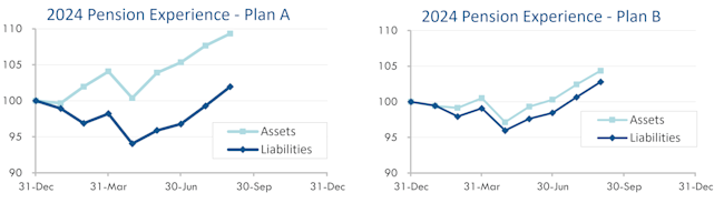 Corporate bond yields fell 0.2% in August but remain slightly above rates at the end of 2023. As a result, pension liabilities rose 2%-3% last month and are now up 1%-3% for the year through August, with long duration plans enjoying the best experience.