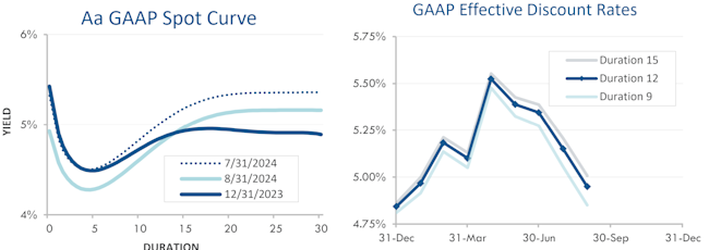 Pension liabilities (for funding, accounting, and de-risking purposes) are driven by market interest rates. The first graph below compares our Aa GAAP spot yield curve at December 31, 2023 and August 31, 2024 (along with the movement in the curve last month). The second graph below shows our estimate of movements in effective GAAP discount rates for pension obligations of various duration during 2024: