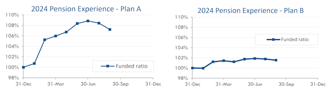 Pension finances slipped modestly in August, as lower interest rates pushed up liabilities. Both model plans we track[1] lost ground last month: Plan A lost 1% but remains up 7% this year through August, while Plan B lost a fraction of 1% last month but remains up more than 1% through the first eight months of 2024: