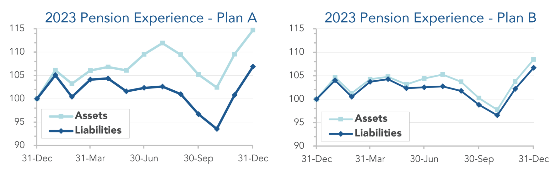 2023 represents another strong year for pension finance, building on improvement in prior years and improving pension funded status to the best condition this century. The graphs below illustrate the path of assets and liabilities for our two model plans during 2023: