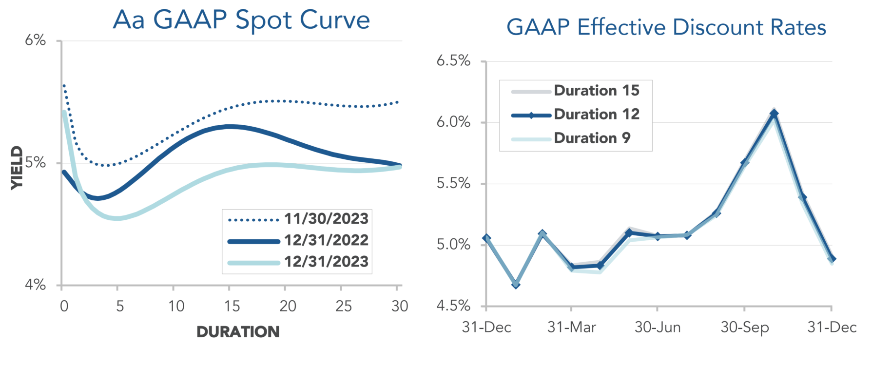 Pension liabilities (for funding, accounting, and de-risking purposes) are driven by market interest rates. The first graph below compares our Aa GAAP spot yield curve at December 31, 2022 and December 31, 2023, and it also shows the sharp drop in rates last month. The second graph below shows our estimate of movements in effective GAAP discount rates for pension obligations of various duration so far this year: