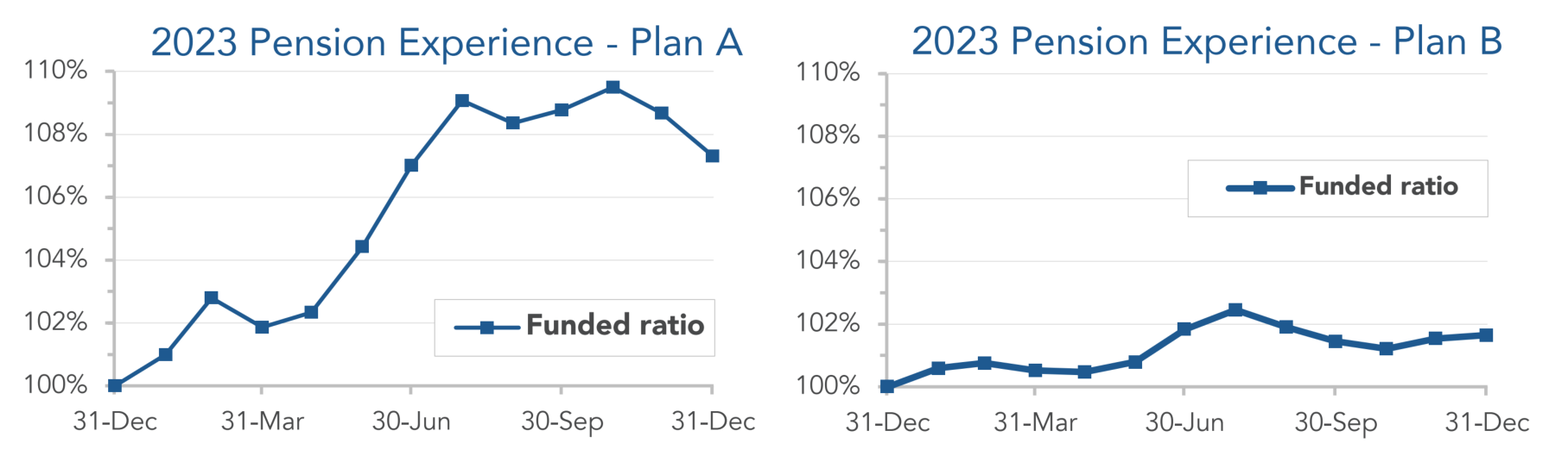 Pension finances were mixed again in December, as lower interest rates pushed up liabilities while higher stock markets increased asset values. Our model plans[1] diverged modestly, with Plan A losing 2% last month but ending 2023 up 7%, while the more conservative Plan B was flat in December, ending the year up almost 2%: