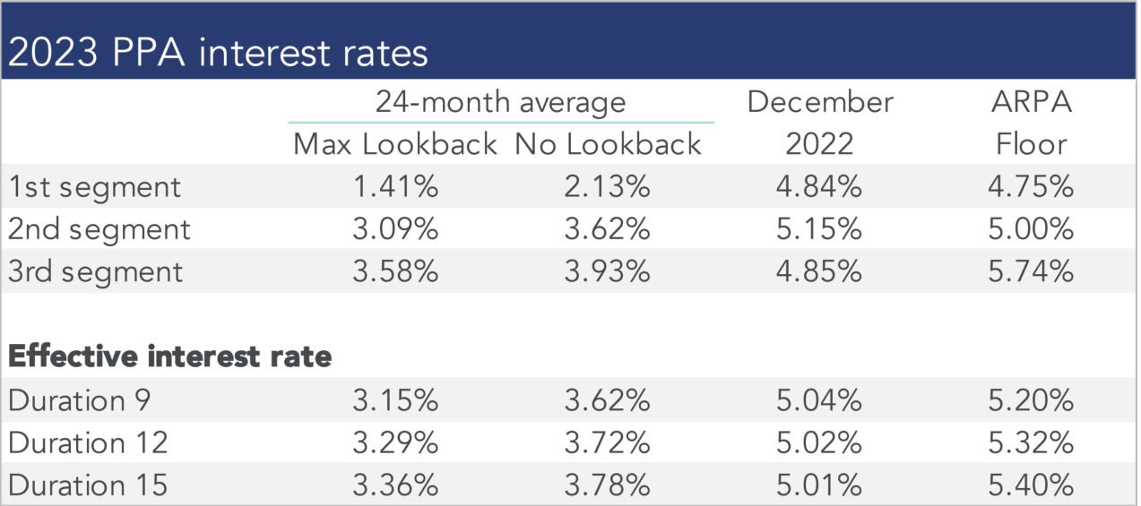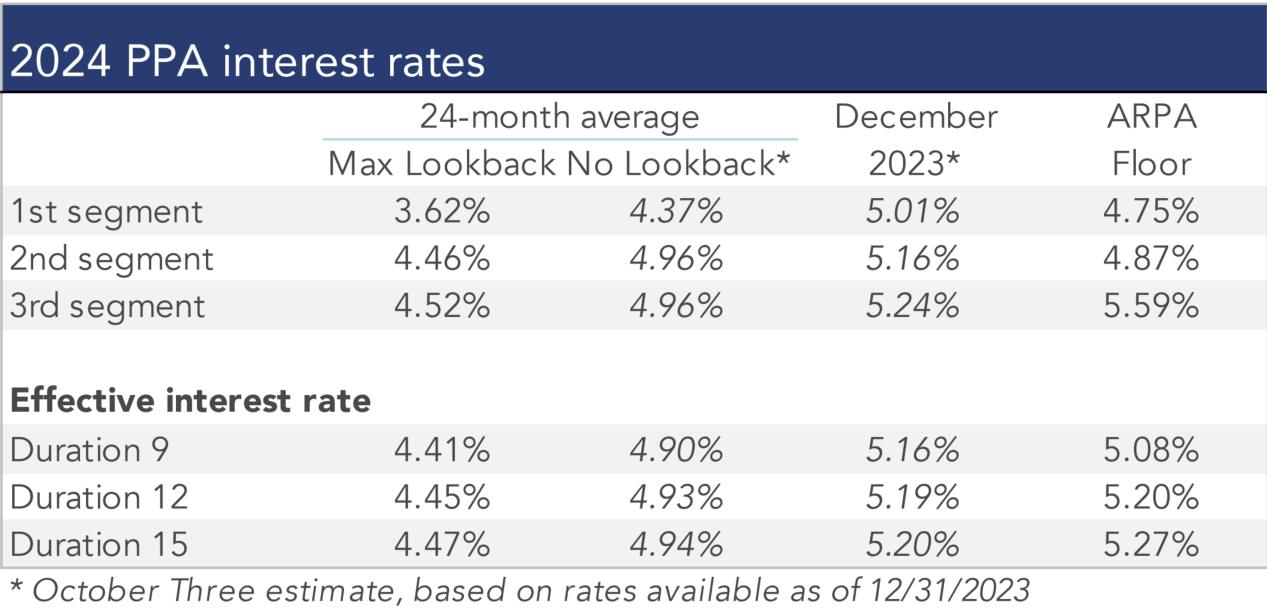 The table below summarizes rates that plan sponsors are required to use for IRS funding purposes for 2023, along with estimates for 2024. Pre-relief, both 24-month averages and December ‘spot’ rates, which are still required for some calculations, such as PBGC premiums, are also included.
