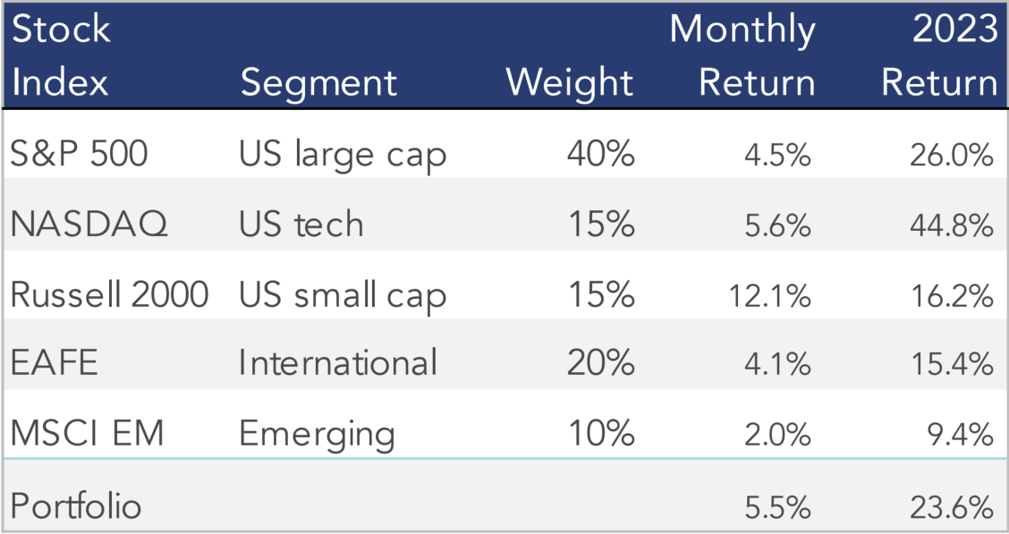Stocks rose again in December, with all major indexes ending 2023 above or near double-digit gains. A diversified stock portfolio added more than 5% last month, ending 2023 up more than 23%: