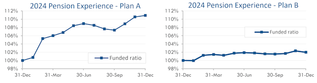 2024 marked yet another strong year for pension finances, capping the strongest 5 and 10 year runs this century. Experience for both model plans we track[1] were mixed in December but positive for the year: the traditional Plan A improved less than 1% last month, ending the year up 11%, while the conservative Plan B lost a fraction of 1% in December, ending 2024 up 2% for the year.