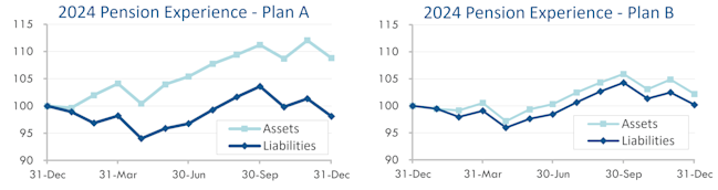 Pension finances have been improving steadily for a decade, and 2024 was no exception. Most pension sponsors are seeing improved funded ratios again this year. The graphs below show the movement of assets and liabilities during 2024: