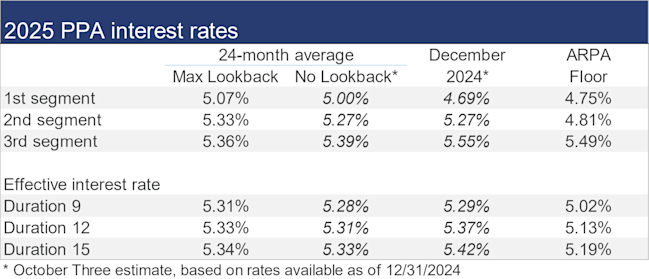 Sustained higher interest rates since late 2022 have substantially diminished the impact of pension funding relief during 2023, 2024, and 2025. Underfunded plans are likely to see higher required contributions in the next few years.
