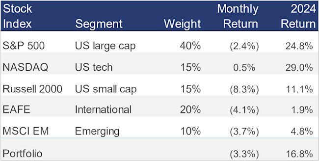Stocks were mostly lower in December but generally enjoyed strong 2024 returns. A diversified stock portfolio lost 3% last month, ending 2024 up almost 17% for the year, with US stocks leading the way: