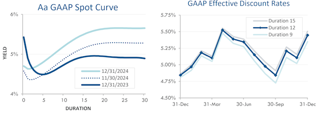 Pension liabilities (for funding, accounting, and de-risking purposes) are driven by market interest rates. The first graph below compares our Aa GAAP spot yield curve at December 31, 2023 and December 31, 2024 (along with the movement in the curve last month). The second graph below shows our estimate of movements in effective GAAP discount rates for pension obligations of various duration during 2024: