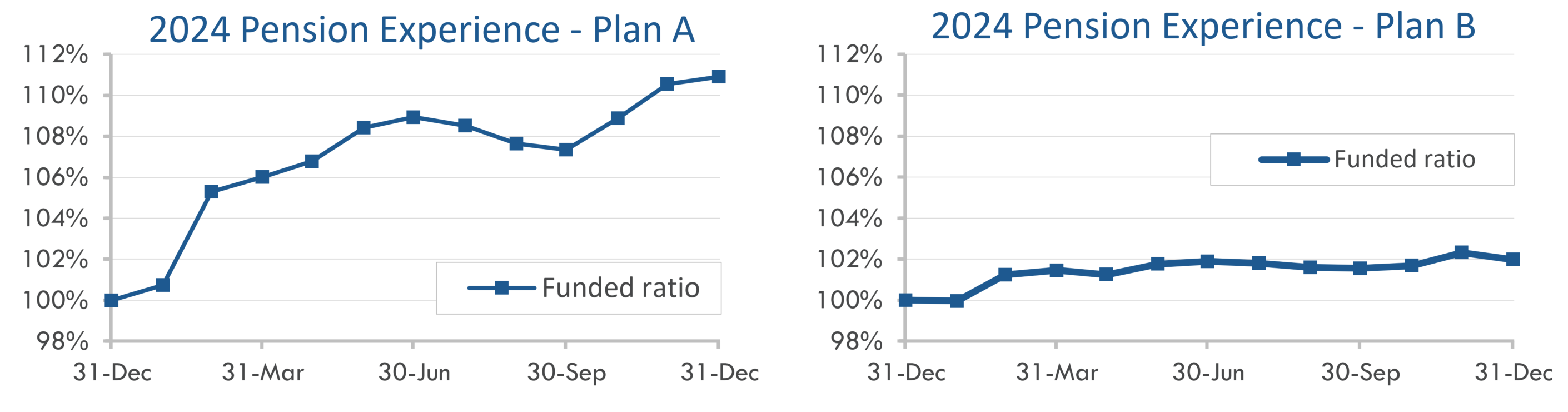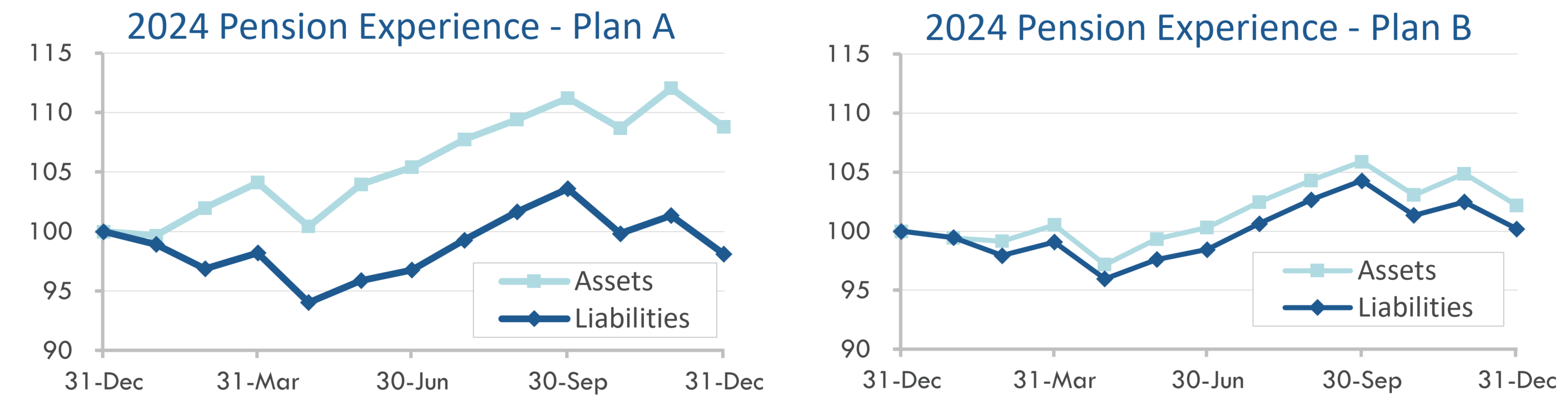 Pension finances have been improving steadily for a decade, and 2024 was no exception. Most pension sponsors are seeing improved funded ratios again this year. The graphs below show the movement of assets and liabilities during 2024: