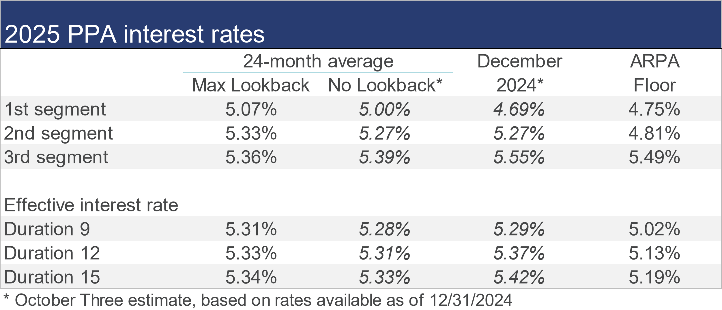 The table below summarizes rates that calendar-year plan sponsors are required to use for IRS funding purposes for 2024, along with estimates for 2025. Pre-relief, both 24-month averages and December ‘spot’ rates, are also included.