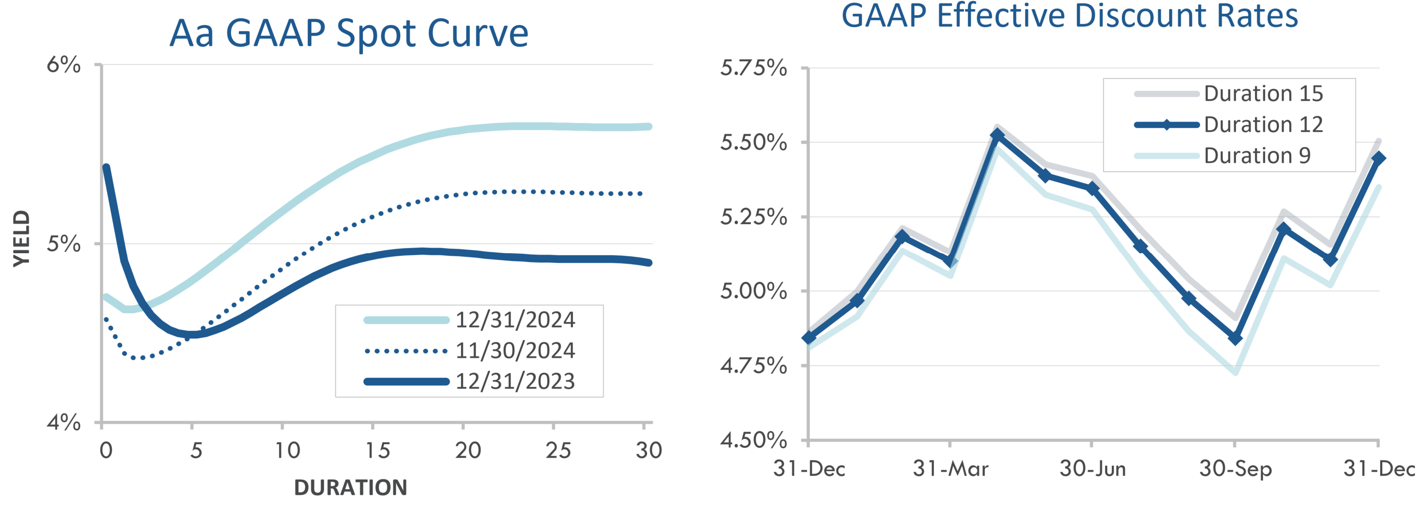 Pension liabilities (for funding, accounting, and de-risking purposes) are driven by market interest rates. The first graph below compares our Aa GAAP spot yield curve at December 31, 2023 and December 31, 2024 (along with the movement in the curve last month). The second graph below shows our estimate of movements in effective GAAP discount rates for pension obligations of various duration during 2024: