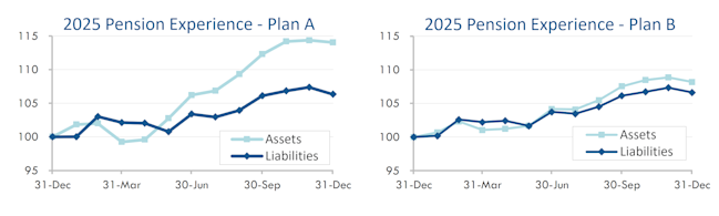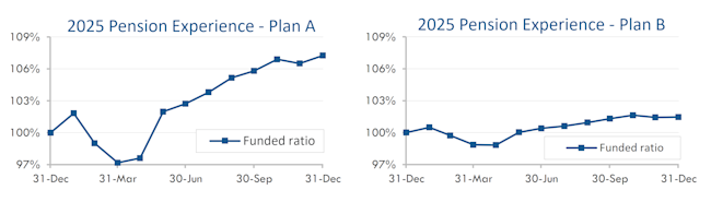 Pension finances improved in December due to higher interest rates, ending 2025 at their high point for the year. Both model plans we track[1] gained ground last month: traditional Plan A improved 1%, ending the year up 7%, while the more conservative Plan B gained a fraction of 1% last month, ending 2025 up almost 2% for the year: