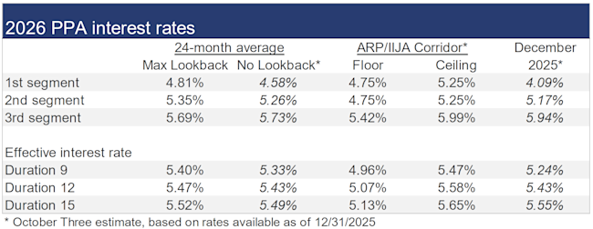 The table below summarizes rates that calendar-year plan sponsors are required to use for IRS funding purposes for 2025, along with estimates for 2026, including the rate “corridor” that applies to the 24-month average rates under funding relief for each segment.